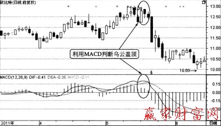 從圖1中可以看出,該股在12.5元高位出現了一個典型的烏云蓋頂,此時我們如何判斷烏云蓋頂就意味著股價下跌呢?如果觀察MACD,BAR柱線已經開始逐漸萎縮,DIF線和DEA線向下趨勢明顯,隨后出現了死叉,死叉出現又加上烏云蓋頂,則股價必然會出現調整。