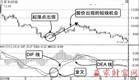分析實例——萬家樂(000533)的MACD黃金交叉,圖所示為萬家樂2010年12月至2011年5月的走勢圖。