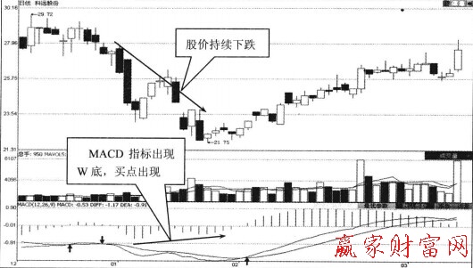 如圖所示,2011年2月中旬,海通集團的日K線走勢圖上出現了MACD指標W底形態。