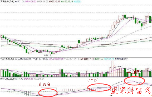 一般說來,迫求資金安全、偏愛長線的投資者應該選擇山谷底MACD雙線合一型個股;而喜歡冒險、偏愛短線的投資者除了可以選擇山谷底和安全區(qū)MACD雙線合一的個股外,還可以用超短線的手法去追擊半山腰MACD雙線合一的個股,但務必要快進快出。