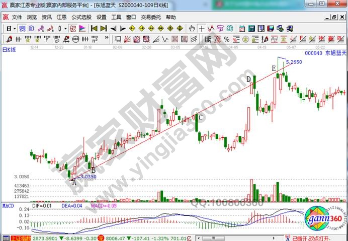 上面是東旭藍天在12年年初到12年5月份的走勢圖,從圖中我們可以看到:股價從A點反轉(zhuǎn)向上,可以畫出一條上升趨勢線。在上升趨勢線沒被破壞之前,可以持續(xù)做多,此后該股在C處長陰線跌破上升趨勢線,原有的上升趨勢線已經(jīng)是被破壞了,所以需要重新確定。
