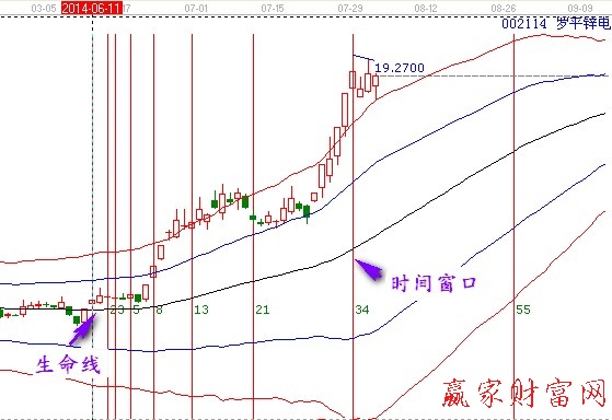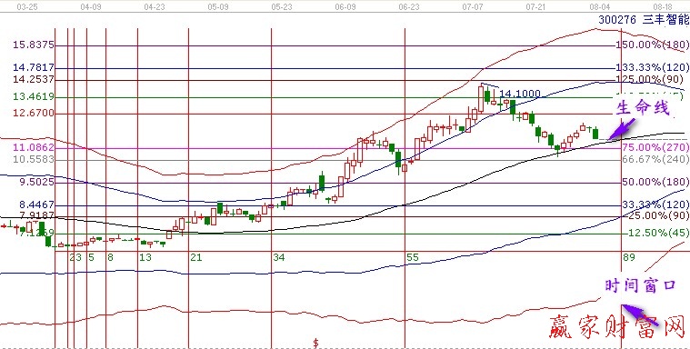 這股票有一個特點就是成長比較溫和,不是快速拉升的股票。這樣的股票選擇作為短線個股就會很糾結,每天上漲幅度很糾結,因此這樣的股票可以作為中線選股。我們從2014年4月28日站上生命線開始看這只股票,之后持股就要有耐性,不破生命線就一直持股該股,碰到壓力減倉,再到支撐位加倉,到時間窗口觀察就更要關注,是加倉還是減倉,這種操作方式適合自己寬裕的投資者。現在股價一直回調,在生命線位置止跌,是否還會走出一波行情就要持幣繼續觀察,看生命線的得失,可以等到時間窗口之后在操作。