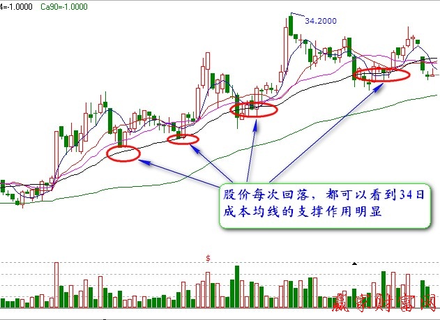 1、股價沖高之后,回落到成本均線附近,此時,均線起到一個重要的支撐作用。投資者可以重點參考5日均線、13日均線、21日均線等,可根據不同的操作周期選擇合適的均線。