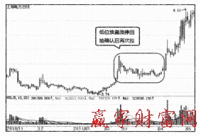 圖1、圖2分別為低位漲停立即拉升和低位漲停后回抽確認再次拉升。