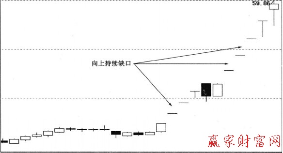 3.在股價K線形成一個向上持續缺口時,表明股價的強勢上漲剛剛開始,投資者應堅決持股待漲。接下來,如果股價繼續以向上持續缺口的方式,向上揚升,則意味著該股的強勢上漲趨勢仍在延續,投資者可繼續持股。如圖所示。