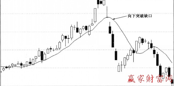 5.在接下來的幾天里,該股股價迅速脫離缺口區域,并一路下跌,向下突破缺口的形態基本確立,投資者可逢高賣出。