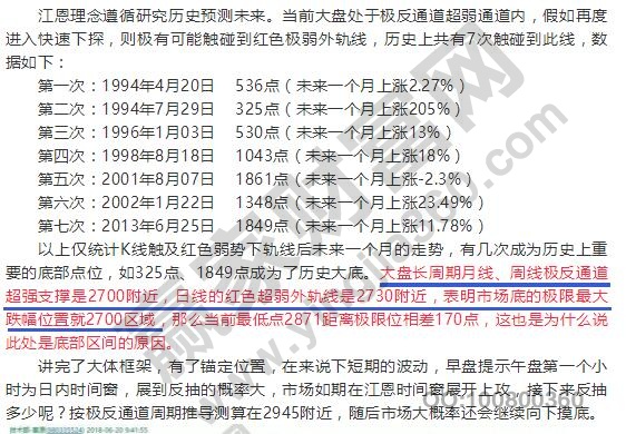 研究歷史、預測未來。6月20的文章通過歷史數據給大家展示了市場底有可能在2700附近,今天最低點是2782點,距離預期點位還有距離,這個點位還不能確定是底部,因為底是反復確認后才能成立,我們對于今天的中陽K線定性為強勢反彈,隨后再次回探時才是真正考驗2700是否構成底部。