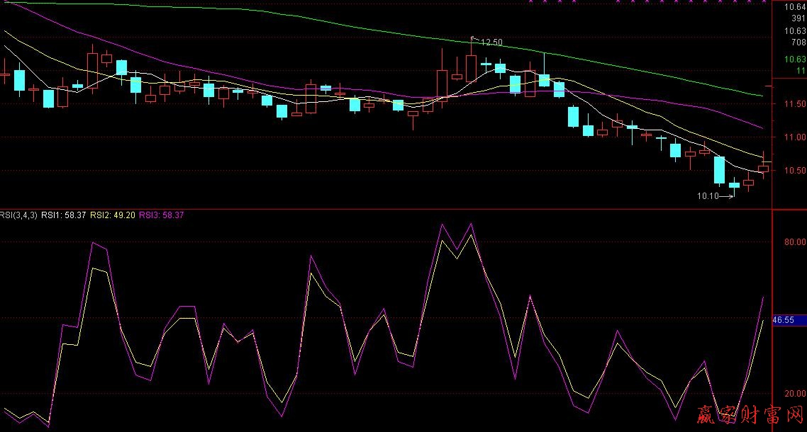 但是由于三條指標線從圖面上感覺較亂,所以,在實際操作過程中,投資者可以用兩條線作為股價走勢的看盤依據。可以將分析指標第一條參數設立為3,第二條設置為4,第三天設置為3。(如下圖所示)筆者認為,在實際操作中這樣比較理想,也更容易看明白股價的走勢趨向。