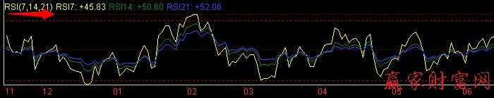 1、需要將RSI指標的N參數分別設置為7日、14日、21日。如圖