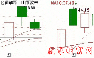 對技術指標狂熱追求的投資者來說k線是可以說話的,k線的形態反映了股市中變化。k線給予股民來說是最為根本的股票基礎知識,接下來介紹一下k線的技術形態之一:山雨欲來。所謂的山雨欲來,指的就是股價在漲勢之中,陽線之后緊跟一根陰線,且陰線的實體一般較大,而陰線的實體與前面陽線的實體兩者之間存在著跳空間隔,這種類型的陰線看起來更像是一種烏云密布的情景,給你一種大兵壓境的感覺一般,古語有云:山雨欲來風滿樓。借助這句詩表達出來的是災難即將降臨的不祥之兆。具體的形態如下圖所示