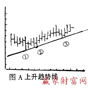 上升趨勢線的畫法就是把兩個或兩個以上的匯價最低點連接起來,所形成的直線。如圖A所示,把圖中如圖A所示,把圖中①②③點(最低匯價點)連接起來就成為上升趨勢線,由于該直線上有三點,故又稱為上升三點趨勢線,有時這條線上的點不止三個。如果落在上升趨勢線上的點越多,說明匯價的上升趨勢越明顯,因而其可靠程度也就越高。