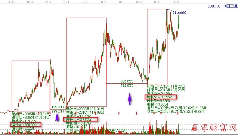 二是個股在歷史上出現過大牛行情后,要盡量回避一段時間。這里分享一下個人的小經驗。當歷史上出現一倍的漲幅,半年內不宜再操作;兩倍行情,一年內不宜操作;也就是如果出現10倍的行情,五年內都不宜操作。這樣做就不用考慮個股什么時候是底部,也會降低持有出現牛市熊股的狀況。這種小技巧可以經過實戰驗證,也可以結合具體的個股做出具體分析。所有的個股都可以進行如下這樣的一個小分析,如圖: