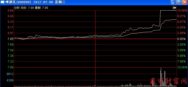 比如2012年2月8日漲停的啤酒花(600090),尾盤拉升或是漲停一般來說就是表示弱勢,那么能否在當天就看出這股票的漲勢呢?這個我是無法預測到的。