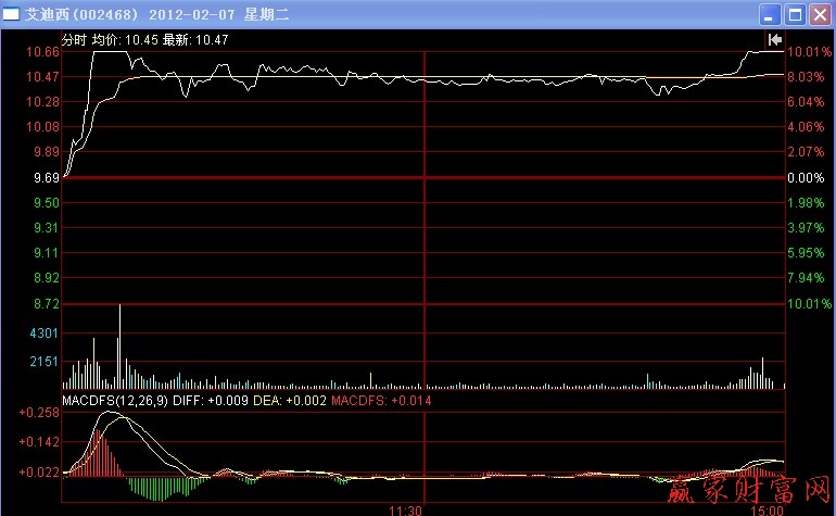 我們再看一只股票艾迪西(002468)在2012年2月7日漲停,如下圖,這天漲停的時候大盤收一個中陰線,盤中也是開板,在經過三個小時的漲停后尾盤拉至漲停,漲停打開可是主力出貨,也可是吸貨,這也表明這個漲停的性質無法判斷。