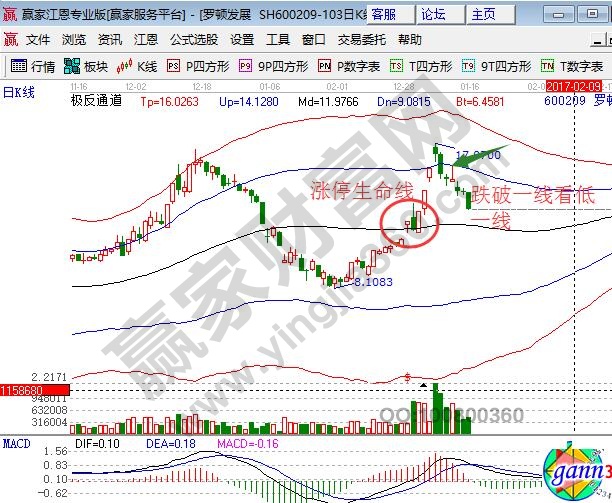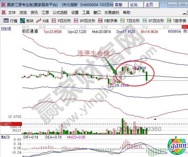 例如,600604市北高新2016年12月22號漲停,收盤價在極反通道生命線上,依據(jù)歷史統(tǒng)計數(shù)據(jù)得出,弱勢行情下使用此方法可保障本金的安全,該股次日高開最次下探至生命線位置,規(guī)則約定為此線為介入點(diǎn),隨后十幾個交易日里行情向外軌線發(fā)展,短線有獲利點(diǎn),最差能做到無利出局。