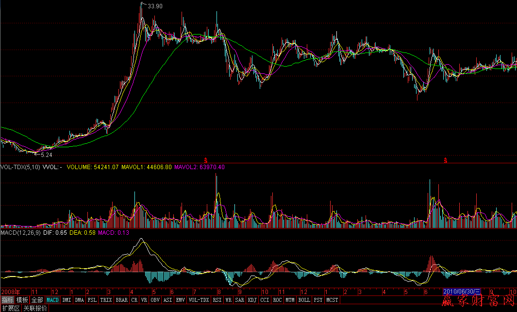 距離說明,我們以中國軟件2008年11月24日到2010年3月23日為參考說明我們列出了四條均線,分別死后MA5、MA10、MA20、MA60,這只股票在經歷了大幅度的上漲之后,在高位區域出現了長時間的橫向走勢,同期的均線系統開始呈現出橫向纏繞形態,通過均線系統,我們可以清晰的判斷出來,這只股票進入了橫盤震蕩趨勢中了。