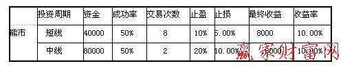 這個模擬投資分為牛市和熊市。在牛市里的成功率要高于熊市,根據中長線、中線、中短線和短線的交易機會(次數)以及可能達到的止盈目標,并以止盈止損比為2:1來進行投資,以此比較這8種投資的收益情況。