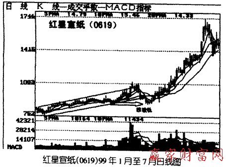 如紅星宣紙1999年初以來已形成一條上升通道,連接1月18日的6.9元至4月12日的8.8元的上升趨勢線一直支撐著股價上行,莊家在該跑道內盡情溜達數個月,但5月4日起股價震蕩回調,5月10日已跌破該上升趨勢線,從5月14日起股價已企穩回升,莊家悄悄地在修一條新的跑道,連接5月24日的9元和6月3日的10.52元形成一條新的上升趨勢線,莊家又在新的跑道內“遛馬”,7月1日股價又跌破這條通道,但僅僅回調數天莊家又緊急“搶修”,新的通道再度形成。對此類莊家修路的個股投資者可注意幾點: