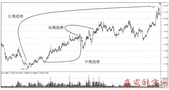 2.中期趨勢。這是指時間一般會持續(xù)2周-3個月的一種趨勢。股價的反彈或回檔幅度至少應(yīng)達(dá)到前一次上漲或下降幅度的1/3。