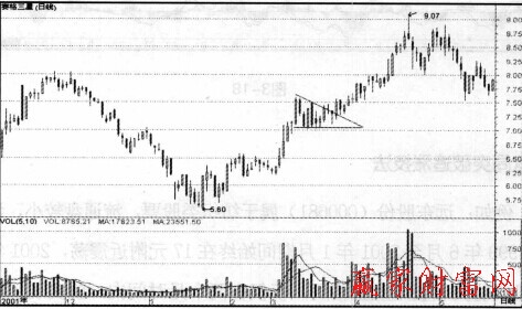 股價上漲的高點基本處于同一價位,回調的低點卻在不斷上移,股價波幅漸漸收窄,成交量不斷萎縮,不過在上升階段成交量較大,下跌時成交量較小。