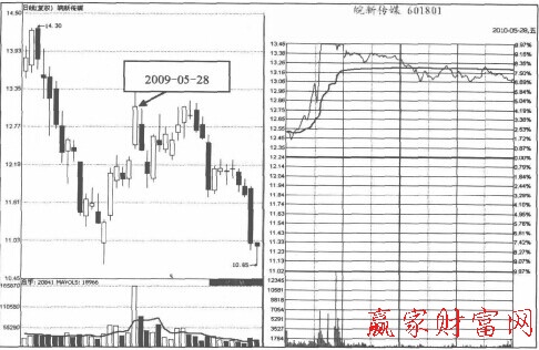 上圖為皖新傳媒(601801) 2010年5月28日的漲停板分時(shí)圖,圖中左側(cè)是此股在2010年5月28日前后的走勢(shì)圖,當(dāng)日此股處在一波反彈上漲走勢(shì)之后,因而面臨著一定的解套拋壓。從當(dāng)日的分時(shí)圖中可以看到,此股在早盤時(shí)間段出現(xiàn)了快速上封漲停板的走勢(shì),但這種漲停板僅僅維持了十幾分鐘,隨后就被大單打開。考慮到此股正處于階段性反彈上漲之后,這既有可能是市場(chǎng)拋壓較為沉重的表現(xiàn),也有可能是莊家誘多出貨的一種手法。在實(shí)盤操作中,這類個(gè)股一般還會(huì)出現(xiàn)一波短期調(diào)整。因此,此類股并不是我們短線追漲的理想品種。