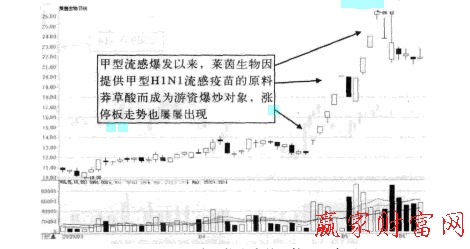 如圖所示為萊茵生物(002166) 2009-03-05至2009-06-04期間的走勢圖,此股在橫盤震蕩之后出現了連續漲停板的走勢,而這種走勢正是基于當時的“甲型流感”疫情這一社會生活中的重大事件,萊茵生物主要以植物功能成分藥物和對藥物的生產在市場上贏得了青睞。在2009年上半年的時候,在國內甲型流感開始爆發以后,萊茵生物因提供甲型HIN1流感疫苗的原料莽草酸而成為游資爆炒對象。在這一熱點事件的支撐下,此股的漲停板走勢也屢屢出現。