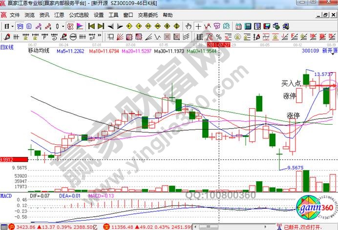 上圖是新開源的2011年8月份的走勢圖,從圖中我們可以看到,在底部出現了兩天強勢漲停,之后股價沖高回落,已經跌到了第二個漲停板的開盤價。這個股票在最后一根K線的時候是低開,并且在當天迅速的拉升向上,當股票拉升到最近的漲停價的時候就是好的買入時機,強勢股回調到拉升前一個漲停時很有可能再次上漲,所以在短線上就可以做T+1了。